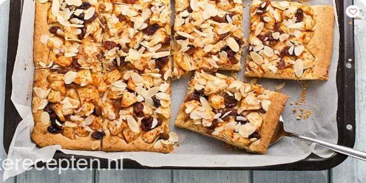 Schep de stukjes appels erop en houd ongeveer 1 cm van de rand vrij. Verdeel ook de rozijnen erover en druk zachtjes een beetje aan. Verdeel als laatste het amandelschaafsel erover en zet ongeveer 40 min. in het midden van de oven. Haal de plaattaart uit de oven en laat afkoelen. Snijd hem daarna in stukken.