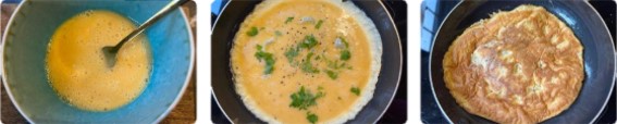 Giet vervolgens het eimengsel erin. Ca. 1-2 min. later strooi je hier de helft van de peterselie op. Bak de omelet aan beide kanten gaar.