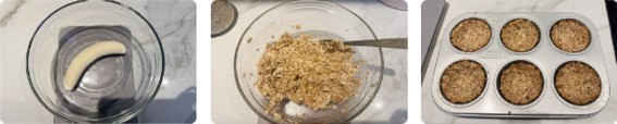 Prak de banaan in een grote kom. Meng met de havermout, honing of agavesiroop, snuf zout en kaneel. Smeer de muffinvorm goed in met olie, bijvoorbeeld kokosolie of zonnebloemolie.
