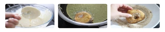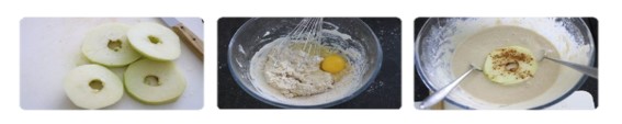 Haal met een appelboor het klokhuis uit de appel en schil de appels. Snijd ze in ringen van ca. 0,5 cm dik. Bestrooi met een snuf kaneel. Haal de appelringen door het beslag en laat iets uitlekken aan een vork. Doe ze in de hete olie en bak ze ca. 3 a 4 min., draai ze halverwege om.