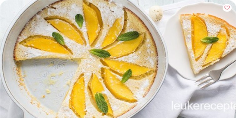 Giet daar het beslag over. Verdeel de rest van de mango, eventueel in een mooi patroon, over de bovenzijde. Bak de clafoutis 30 min. in de oven. Bestrooi voor het serveren met poedersuiker en wat verse munt.