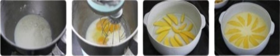 Verwarm de oven op 180°C. Doe de bloem, eieren, melk, citroensap, vanillesuiker en 50 g suiker in een kom en mix door elkaar. Vet de ovenschaal in met een beetje boter. Bestrooi met de eetlepel suiker. Verdeel ongeveer de helft van de mango over de bodem.
