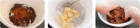 Snijd de koude boter in blokjes en voeg deze toe. Wrijf met je vingers of met een deegkneder de boter door het meel tot er kruimels ontstaan.