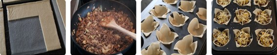 Verwarm de oven voor op 180°C. Vet de muffinvormpjes in met wat olijfolie. Laat de vellen deeg voor hartige taart ontdooien, snijd wat kleiner en vul de muffinvormpjes met het deeg. Strooi daarna wat paneermeel op de bodem van de vormpjes. Snijd de ui klein en fruit aan in een pan. Voeg daarna het gehakt toe en bak deze rul en gaar. Breng op smaak met wat peper en zout en een flinke snuf paprikapoeder. Voeg daarna de maïs toe en bak even mee.