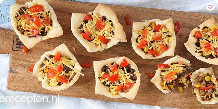 Vul de muffinvormpjes verder met het gehaktmengsel. Verkruimel de tortilla chips erover en strooi er wat geraspte kaas overheen. Zet ca. 15 min. in de oven. Garneer met wat fijngesneden stukjes tomaat. Ook lekker met een schepje zure room.